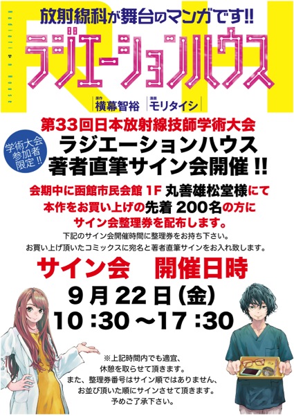 第33回日本放射線技師学術大会参加者限定で、函館市民会館1Fの丸善雄松堂にて同作をお買い上げの先着200名様にサイン会の整理券が配布される。9月22日の10:30〜17:30に整理券をお持ち頂くことで、お買い上げ頂いたコミックスに宛名と著者直筆サインをお入れする。