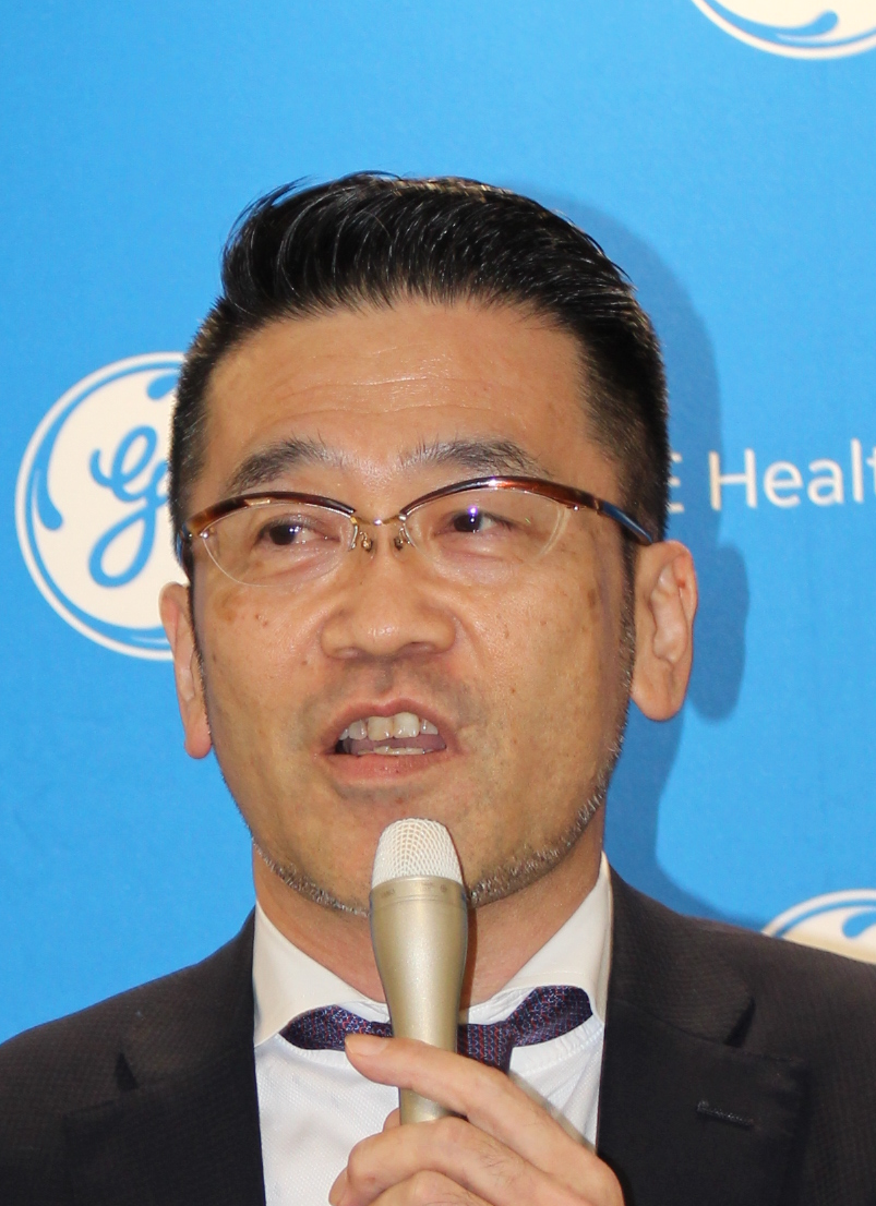 まず、同社クリニカルケア・ソリューション本部長の黒川貴史氏が、汎用超音波装置の最上位機種となる「LOGIQ E10」について説明した。早期診断が難しい膵臓がんの診断においては、悪性度の高い病変を発見するだけでなく、より早期にハイリスク患者を絞り出すことが重要と指摘し、LOGIQ E10の持つ①瞬時に大量のデータが取り込め、客観性の向上②ミリ単位の形態変化を把握できる高画質で近位部、深部までの高い均一性の実現③血流イメージング機能の向上などにより、空間分解能が飛躍的に高まり、低流速から高流速までの血流を視覚化しやすくなった――などの特長を挙げ、「非侵襲的で総合的な膵臓がんの早期発見に貢献できるもの」と述べた。
