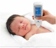 コニカミノルタの黄疸計は、新生児黄疸(*1)を採血することなく、胸や額に光をあてることによって測定する装置で、産科および小児科などで使用されている。