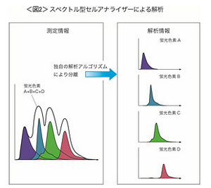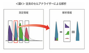 一般的なセルアナライザーは、目的とする蛍光情報を検出するために、光学フィルターを使用して蛍光波長域(チャンネル)別に分割、抽出し、その蛍光の強さのみを測定している。この方式では、ある特定の蛍光波長域を抽出しても、同じチャンネル内に複数の蛍光色素の情報が重なりあった状態で検出されることになり(図1)、この補正作業が必要となる。そのため、解析の精度と再現性、作業スピードなどが課題となっている。