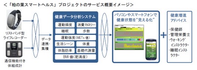 柏市、三井不動産(株)、イーソリューションズ(株)、日本ヒューレット・パッカード(株)、(株)メディシンクをはじめとするコンソーシアムは2月2日から、ICTを活用して日常の健康状態を“見える化”するサービスの実証事業「柏の葉スマートヘルス」プロジェクトを、柏の葉スマートシティ(千葉県柏市・柏の葉キャンパス地域)において開始する。「柏の葉スマートヘルス」プロジェクトでは、最先端のリストバンド型ライフレコーダー(活動量計)や通信機能付き体組成計といったデジタル健康機器をICTネットワーク経由で健康データ分析システムに連携させ、パソコンやスマートフォンで利用者の健康状態を表示するサービスを提供する。同サービスを利用することで、運動量や消費カロリー、体脂肪率などの基礎健康データだけでなく、睡眠や活動内容など24時間の生活リズムまで細かく確認でき、現在の健康状態や体調変化の原因が簡単に分かるようになる。
