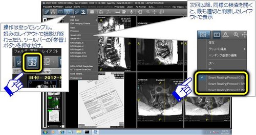 従来は手作業で画面上に画像を配置する必要があり、思い通りの場所に画像を配置するために時間を費やさなければならないことが読影の生産性低下につながっていた。「Centricity Universal Viewer」では、ユーザーが好む画像の配置(ハンギングプロトコル)を学習する「スマート・リーディング・プロトコル」機能を搭載。GEのグローバルリサーチセンターと共同開発したこの学習機能により、表示レイアウトを繰り返し学習させることで個々のユーザの好みのレイアウトで画像表示できるようになるため、読影時の負担が大幅に軽減される。