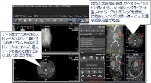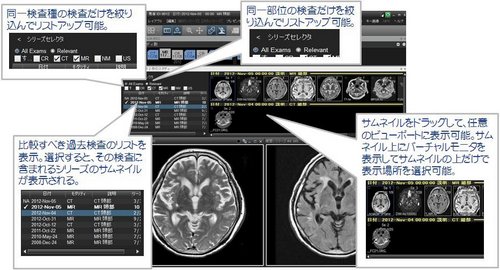 ナビゲータ内の「シリーズ・セレクター」により直感的でシンプルな過去検査比較の呼び出しや比較検査の絞り込み機能を搭載した。またサムネイル上のバーチャルモニタを搭載することで、画像の並べ替えのためのマウスの移動距離やクリック回数を大幅に低減、日々大量の読影を行う読影医の作業負担を軽減する。