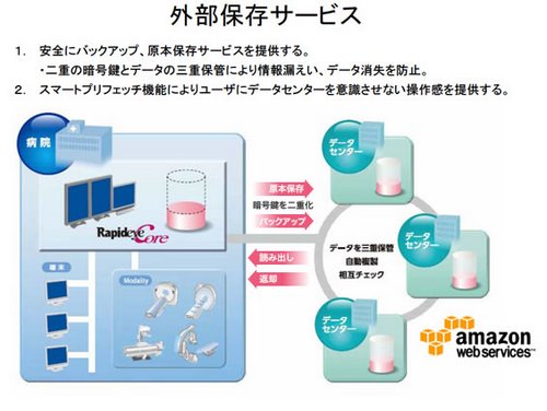 本サービスは、東芝メディカルシステムズが提供するPACS(RapideyeCore™)の電子保存および運用管理技術と東芝が持つクラウド技術を組み合わせ、アマゾン ウェブ サービス®が提供するクラウドサービスを利用し、お客様へ安心・安全な新しいソリューションを提供する。