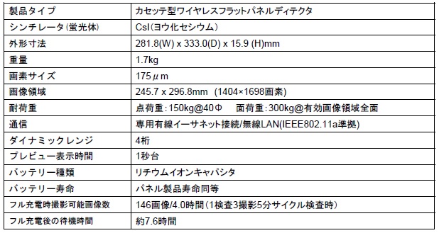 無線対応のワイヤレスタイプなので、操作の妨げとなるケーブルなどが無く、CRカセッテ使用時と同様の撮影環境を提供する。また、X線曝射後1秒台でコンソールモニターにプレビュー画像が表示されるので、撮影が適正だったか等の確認を瞬時に行う事ができる。