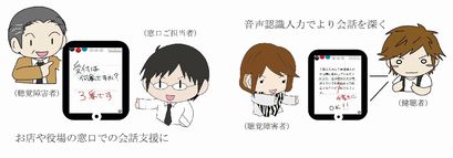 (株)アドバンスト・メディアが音声認識アドオン「声で文字を入力」に提供した音声認識技術には、厚生労働省障害者自立支援機器等開発促進事業により、一般社団法人全日本難聴者・中途失聴者団体連合会の協力の下、聴覚障害者の日常生活支援機器として研究開発された成果を反映されている。『UD手書き』と「声で文字を入力」を組み合わせることにより、健聴者と聴覚障害者のコミュニケーションがスムーズなものになり、家族や友人との会話などあらゆるシーンに有効活用できる。また、聴覚障害者が活用するだけでなく、店舗や企業、役所などが同アプリを用意することにより、聴覚障害者とのコミュニケーションツールとして顧客サービスの向上に貢献する。
