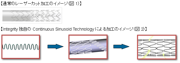 Resolute Integrityシリーズのプラットフォームとして採用されている「Integrity冠動脈用ベアメタルステントシステム」(2011年9月発売)はContinuous Sinusoid Technology(連続正弦波形状技術)と呼ばれるメドトロニック独自の技術が最大の特徴である。一般的に、ステントは金属のチューブにレーザーカット加工を施すことで成形する(図1)のに対しIntegrityは、一本のワイヤーをらせん状に巻きつけていくことで成形され(図2)、世界でも唯一無二のプラットフォームとして高い評価を得ている。この独自のプラットフォーム特性により、複雑な血管走行や病変形態においても、より柔軟で優れた通過性を実現している。
