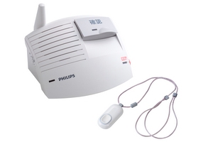 「フィリップス緊急通報サービス」は、北米で35年以上の歴史のあるサービスで、専用通信機を自宅の固定電話に接続し、救助が必要なとき首から下げたペンダントのボタンを押すと24時間365日、フィリップスの安心サポートセンター(コールセンター)に通報できる。ケガをしたり気を失ってボタンを押せない状況でも、ペンダント内蔵の複数センサーが転倒・転落を検知し、自動で同センターに通報するというもの。