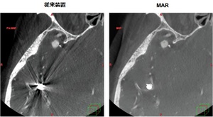LCIでは、体内に留置された金属の治療デバイスからのアーチファクトによる画像劣化が指摘されていた。これを改善すべくMetal Artifact Reduction(以下MAR)再構成を開発し、金属アーチファクトを大幅に除去する。MARによってコイルから発生する金属アーチファクトが除去され、近傍の血管が確認できる。