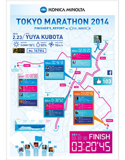 「KONICA MINOLTA presents SOCIAL_MARATHON in TOKYO 2014」申込者には、東京マラソンのラップタイム、フィニッシュタイム(速報値)、SNSの友人からの応援メッセージなどの情報を記載した自分だけの記念レポート、「FINISHER’S_REPORT」をフィニッシュエリアにてコニカミノルタの複合機「bizhub」でオンデマンドプリントされプレゼントされる。また、「FINISHER’S_REPORT」は大会当日18時より、「SOCIAL_MARATHON in TOKYO 2014」申込者全員にA4サイズのドキュメント(PDF)にしてサーバー上にも提供。こちらはfacebookやtwitterを通じて友人にシェアすることができる。
