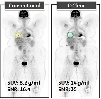 加えて「Q.Clear」では、従来PET画像再構成法と比較して、画質を約2倍(GE社内比較)に向上、微小病変の描出能力や、隣接する病変の識別能力が高まりる。さらに肝臓のようにノイズの多くなりやすい部位でもクリアな画質を実現するため、診断精度が飛躍的に向上する。
