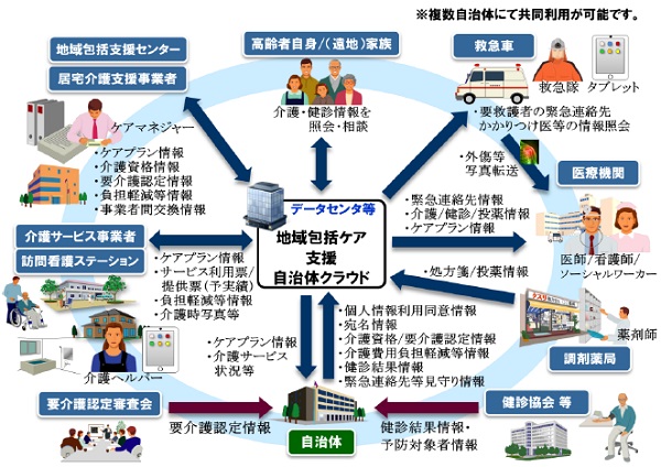 このような背景のもと、同社は、地域包括ケアシステムの構築をめざす自治体向けに、高齢者をはじめとする要介護者の情報を、必要な地域の関係者で高いセキュリティレベルのもと共有可能にするクラウド型の情報連携基盤「地域包括ケア支援自治体クラウドソリューション」の提供を開始する。従来、自治体や、地域の医療機関、薬局、介護事業者などが個々のデータベースに蓄積し把握、利用していた要介護者の緊急連絡先や要介護認定状況、健康診断結果、ケアプラン、お薬手帳、さらには現在の病状といった情報をクラウド上に集約し、家族や自治体、医療機関、救急隊、介護事業者などが、インターネット経由でパソコンやタブレット端末などからリアルタイムで閲覧することを可能にする。