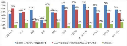 「デンスブレストと乳がんの発症の関係についてご存知ですか?」の質問に対し「はい」と回答した日本人は2%(グローバル平均は27%)と10カ国で一番低い数値になった。
