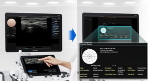 S-Detect : スキャン後、シードポイントを選択すると自動的に腫瘤の境界線を描出、データの分析から単数、複数のイメージが表示される。標準化された乳腺イメージレポートとBI-RADSデータを採用することで、日々の診断のサポートを行うアプリケーションだ。