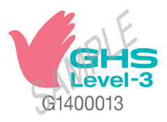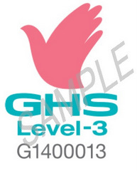 健康・躍動感をイメージする大空に羽ばたく鳥と、健やか・幸せをイメージする大きく広げた美しい女性の手のひらのモチーフを重ね合わせる事で、GHSに登録された製品が人々の健康へ有益なものであることを伝えることをイメージしたもの。(GHSマークは商標登録済み)