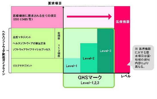 GHS開発ガイドラインは、推奨される4つの要求事項「リスクマネジメント」「品質マネジメント」「ヘルスソフトウェアの製品安全」「ソフトウェアライフサイクルプロセス」から構成されており、法規制対象外のヘルスソフトウェア開発やヘルスソフトウェア事業への新規参入者が段階を追ってスキルを高めることができるように3つの適合レベルを設定している。なお、法規制対象外のヘルスソフトウェアの安全を実現するにあたって、リスク分析を含むリスクマネジメントは不可欠であるため、リスクマネジメント要求への対応はガイドライン適合レベルLevel1~3のすべてに必要としている。