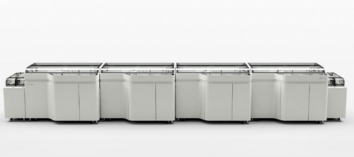 新製品は、2つの分注ラインを効率よく高速サンプリングさせることで、比色(注1)最大2000~8000テスト/時の高速検体処理が行える。さらに産業用ロボットに使われているロボティクス技術を備えた三次元ロボットアームが効率よく検体ラックを移送することで、高速化・効率化を実現する。新製品は必要とする処理速度に応じて1台タイプから、最大4台連結タイプまで選択できる。