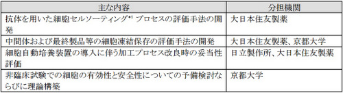 大日本住友製薬(株)(以下「大日本住友製薬」)、国立大学法人京都大学iPS細胞研究所(以下「京都大学」)、(株)日立製作所(以下「日立製作所」)の3者は、経済産業省および国立研究開発法人日本医療研究開発機構(以下「AMED」)の 2015年度「再生医療の産業化に向けた評価基盤技術開発事業(再生医療等の産業化に向けた評価手法等の開発)」に係る委託先として採択された課題の共同研究に着手する。