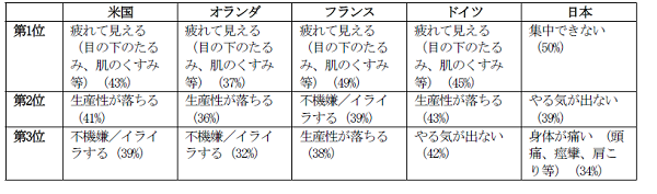 日本を除く4カ国では、一晩よく眠れなかったために生じる悪影響の第1位は「疲れて見える」だったが、日本での第1位は「集中できない」だった。
