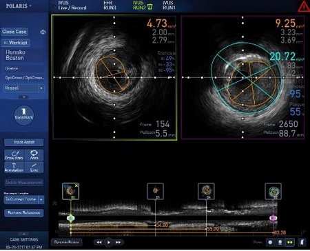 「PolarisTM」は、冠動脈や末梢動脈におけるIVUS(血管内超音波診断)とFFR(冠血流予備量比)に対応する画像診断装置iLabに導入されているソフトで、ユーザーインターフェースを工夫し、術中の全ての操作をマウスでできるようにし、使用される医師や技師の方々が直観的に操作できることを可能としたことで、診断時間の短縮を実現している。「PolarisTM」の詳細は以下の通りである。