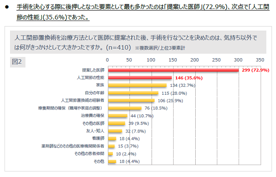 医療機関受診後、人工関節置換術を提案された患者さんが手術を決めた理由は「激しい痛みを感じたから」(58.3%)、「医師の説明に納得できたから」(55.1%)、「信頼できる医師・病院だったから」(52.9%)などが上位にあがった。また、手術を決心する際に後押しとなった要素として最も多かったのは、「提案した医師」(72.9%)、「人工関節の性能」(35.6%)であった。