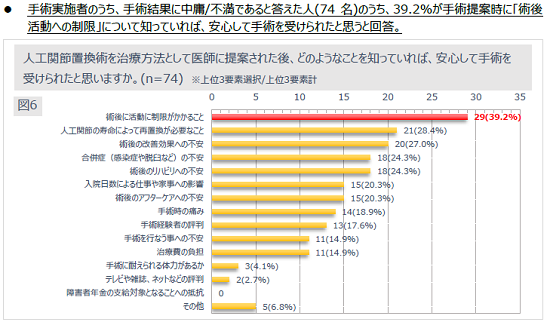 人工関節手術を提案されたが実施しなかった患者は「術後どれだけ回復が見込めるかの情報」(61.3%)があれば手術をより決断しやすかったかもしれないと回答。また、「主治医との相談時間」が必要だという回答も(52.7%)あった。また、術後の満足度が低い患者さんの39.2%は、手術を提案された際に術後に活動に制限がかかることを知っていれば安心して手術を受けられたかもしれないと回答した。