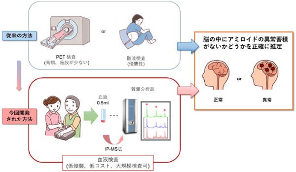 (株)島津製作所と国立長寿医療研究センターは、2014 年に発見した質量分析システムを用いたアルツハイマー病血液バイオマーカーにつき、世界有数のアルツハイマー病コホート研究の組織である豪州のAustralianImaging Biomarkers and Lifestyle Study of Ageing(AIBL)と連携し、京都大学、東京大学、東京都健康長寿医療センターならびに近畿大学と共同で、さらに研究開発を進め、現在用いられている脳脊髄液(CSF)やPET イメージングの検査に匹敵する極めて高い精度のアルツハイマー病変(アミロイド蓄積)検出法を確立した。アミロイドの脳内蓄積は発症20 年以上前に始まり、アミロイドが脳内に蓄積した方はアルツハイマー病の発症リスクは高いと考えられる。CSF 及びPET 検査はそれぞれ侵襲性と高額な検査費用のため、数千人規模の参加を必要とする臨床治験への適用には限界があった。本研究成果は、採取が容易な血液(僅か0.5 cc)でアルツハイマー病変を早期に正確に検出することを可能にするものであり、世界的に未だ成功していないアルツハイマー病の根本的な治療薬、予防薬開発の飛躍的向上に大きく貢献するものと期待される。