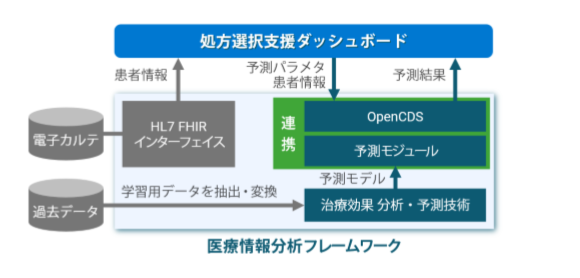 本システムは、昨年11月に、ユタ大学と共同開発した機械学習を用いた「糖尿病治療薬の効果を予測・比較する技術」*2を、ユタ大学の診療意思決定支援システム(OpenCDS*3)と統合し、次世代医療通信規格のHL7®FHIR®*4を用いることで、HL7 FHIR対応型電子カルテと連携可能な処方薬選択支援システムだ。本システム開発にあたり、学習に用いるデータ数や項目数を増やすことで、「糖尿病治療薬の効果を予測・比較する技術」の予測性能も向上した*5。また、本システムは、さまざまな機械学習モデルを電子カルテと連携させるプラットフォームとしても活用可能である。