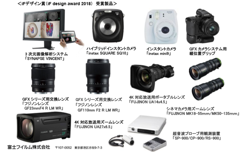 富士フイルム(株)は、3次元画像解析システム「SYNAPSE VINCENT」、ハイブリッドインスタントカメラ「instax SQUARE SQ10」などのチェキシリーズや、超音波プローブ用観測装置、放送用レンズなど主要10製品が、デザイン振興のための国際的な組織「iFインターナショナルフォーラムデザイン(ドイツ・ハノーバー)」主催の「iFデザイン賞(iF design award 2018)」を受賞した。「iFデザイン賞」は、1953年に設立された国際的なデザイン賞で、ドイツの「red dot design award」、アメリカの「IDEA」と並び、世界三大デザイン賞のひとつに数えられる権威ある賞だ。今年は、54の国・地域から6,401点の応募があり63名の専門家により審査された。