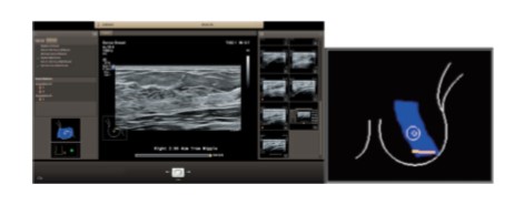 電磁トラッキングコイルを内蔵する新たなPureWaveリニアトランスジューサeL18‐4 EMTと、マットレスに内蔵された「テーブルトップ型フィールドジェネレーター」により、トランスジューサの位置情報が自動的にトラッキングされ、トランスジューサの走査軌跡が視覚的に分かるよう、Body Mark上に軌跡の塗りつぶしをするマッピング機能をもっており、これにより、乳房全体の確実な走査を補助する。さらに、Auto Annotate機能により、ワンタッチで乳頭からの距離と場所(時計軸表示)が自動表示され、その他さまざまな機能とともに、煩雑なワークフローから検者を開放し、検査に集中することが可能になる。