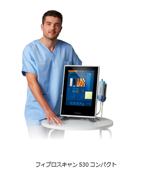 「フィブロスキャン530 コンパクト」は、肝臓の硬さと脂肪量の度合を非侵襲に、同時に測定する装置で、肝臓の線維化、脂肪肝の有無・度合いに関するデータが得られる。肝線維化と脂肪肝の度合を数値で評価することで、疾患進行の早期診断に繋がり、深刻な病態へ進行することに対しての予防にもなる。関連論文は現在、2,000を超えており、それら豊富なエビデンスに基づいて、肝硬変、肝がんなどに至る肝臓疾患の診断、治療の効果判定、予防など、肝臓の病態評価の目的で世界80カ国にて使用されている。