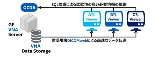 日本の医療課題の解決に取り組むヘルスケアカンパニー、GEヘルスケア・ジャパン(株)(以下、GEヘルスケア)は、GEヘルスケアが持つオープンなデータ管理プラットフォームであるVNA(Vendor Neutral Archive)と、そのデータベースをオープンに開示するOCDB(Open Connect Database)、さらにデータ交換の高速化のためのDICOMweb技術を組み合わせてマルチベンダーと高速に接続し、臨床画像診断で活用するという国内初の取り組みを開始した。これら技術の組み合わせは、他社ビューワがVNA接続時に高速でデータへのアクセスを可能にする新しいソリューションである。これにより、異なるメーカーのビューワがVNAからデータを取得する際の遅延が解消され、同一メーカーのビューワとPACSの接続時とほぼ同じスピードでデータ転送が行えるようになる。その第一弾として、PSP㈱(以下、PSP)のビューワが接続され、慶應義塾大学病院にて臨床画像診断での利用が開始された。