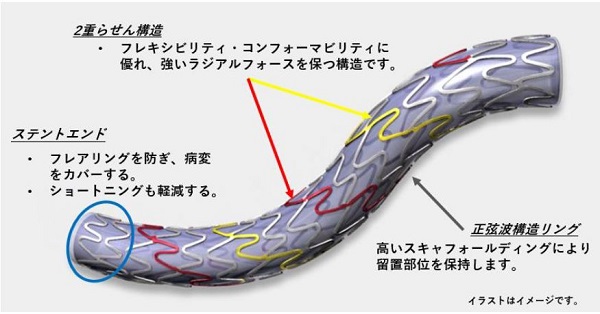 リコイル※3を防ぐ強いラジアルフォースと2重らせん構造による優れたコンフォーマビリティを兼ね備えたステンレス鋼製のプラットフォームを採用している。リングデザインは正弦波構造で、高いスキャフォールディングにより留置部位を保持。ステントエンドは、フレアリング※4を防ぎ、病変をカバーする。また、ショートニング※5を最少に抑える工夫が施されている。