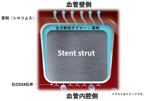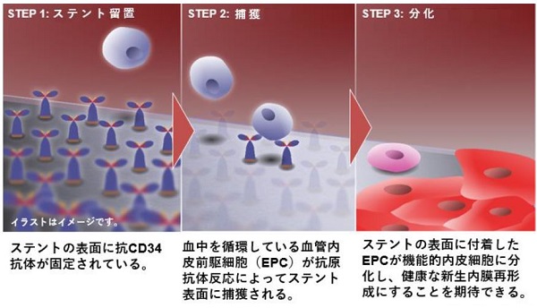 本製品に搭載される抗CD34抗体は、循環血中内に存在し、損傷した血管内皮の修復に関与することで知られる血管内皮前駆細胞(endothelial progenitor cells EPC)を抗原抗体反応により捕獲する機能を有している。捕獲されたEPCはステント表面で血管内皮へ分化し、ステント内腔の再内皮化(ステント被覆)に寄与することが期待される。