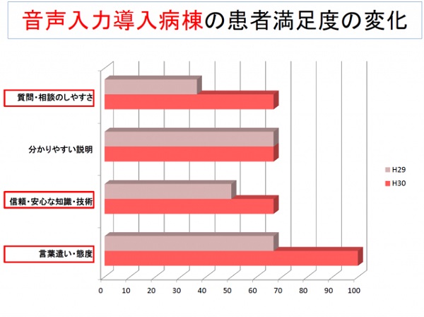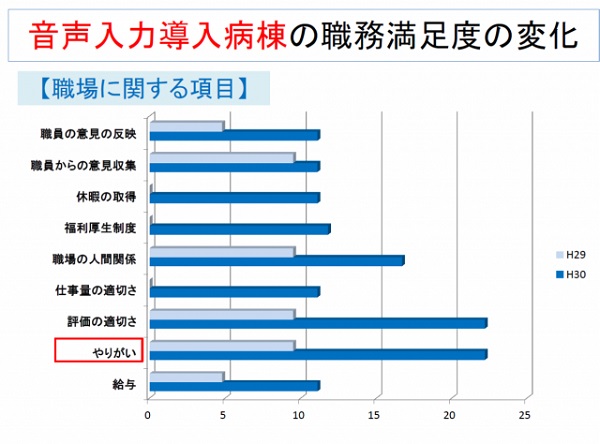 患者情報収集等の記録業務に音声入力を用いる事で、1人あたりの月平均時間外勤務時間を約2分の1に削減する等、業務効率化に大きく貢献し、患者満足度・職務満足度の向上を実現した。
