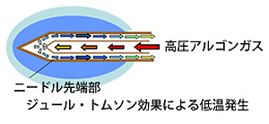 高圧アルゴンガスを使用し、そのジュール・トムソン効果によって、ニードル先端部に低温を発生するものである。