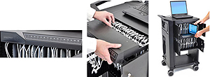 タブレットPC管理カートは最大48台のiPadなどのタブレットPCを同時に充電・同期できる。複数台のiPadの充電を1回で、コンパクトなスペースで簡単に行える。さらにノートPCを接続すると同期モードになり、接続されているすべてのiPadを同期するので、OSやソフトウェアの更新、コンテンツの入れ換えも簡単に行える。