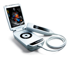 Vscanは、米ゼネラル・エレクトリック(GE)が2009年5月に立ち上げた医療に関するビジネス戦略「ヘルシーマジネーション(healthymagination)」の厳しい認証審査をクリアし、2010年10月1日に国内販売を開始した同社最小・最軽量(本日現在)の超音波診断装置。どこへでも持ち運べる手軽さと片手で扱える操作性に加え、在宅や僻地など多彩な医療ニーズに応える高い臨床性能を兼ね揃えた装置となっている。デザイン面では、重さ約390gと小型で軽量、プローブ(探触子)にも軽量化を施したほか、本体に接続するケーブルも薄型で柔軟性の高いものを採用。バッテリー駆動による可搬性に加えて、ディスプレイの開閉による素早いオン・オフやダイヤルキーの採用など片手で扱えるシンプルな操作性を実現するなど、使い勝手にもこだわりを持っている。加えて先端的な技術を用いた半導体チップの採用で、高性能ながら低消費電力も実現した。
