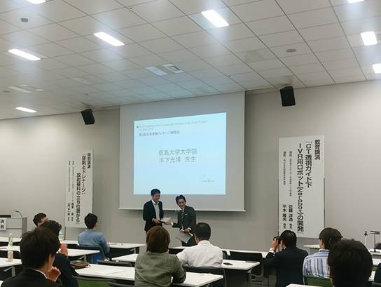 最優秀演題賞は、徳島赤十字病院の木下光博先生[PTBDにおける仮想透視画像(Virtual Fluoroscopy)活用の試み]が受賞された(図2)。PTBDの際に、事前にWorkstation(SYNAPSE VINCENT)で胆管像を作成しておき、これを参照しながら穿刺・挿入するというものであった。最近のIVR機器には備わっている機能で、血管で使用する事が多いが、これを胆管に応用するといった内容であった。穿刺時やガイドワイヤ挿入時にイメージが沸き易いため、術者の安心度を高めるという意味では有用な手法と考えられる。発表のみでなく、受賞後のスピーチも秀逸で、3 ヶ月間週1日徳島から福井県済生会病院の宮山士朗先生の元に通われて、IVRの研鑽のみでなく、研究に対する姿勢を学び、今回の受賞につながったとの感動的なスピーチであった。