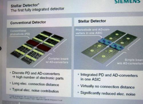 今回のトピックは、X線の検出効率が改善された“ステラディテクター”の開発である。ステラディテクターとは、X線検出器のフォトダイオードとAD変換を一体化(Full electronic integration)によって、電気的ノイズ、AD変換の入出力による信号の減弱、熱損失、クロストークを低減することが可能となる。200mAで約25%ノイズが向上される(図1、2)。