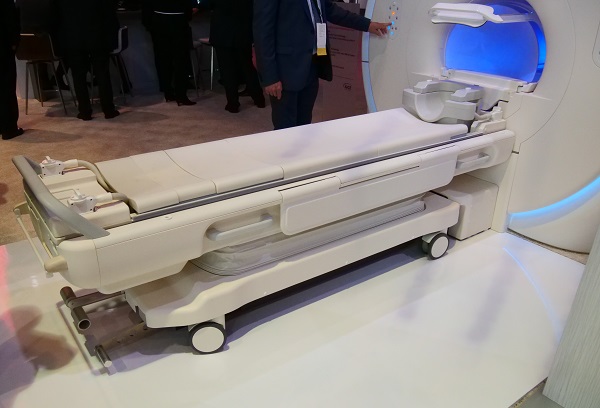 さらに、寝台左右動の機能が備わっている。これはSUREPositionにより、寝台の位置合わせの時に操作室からリモートで操作が可能となっており診療放射線技師の被ばく低減に貢献している。また、当製品は開放感のあるフレアデザインを採用しており、大きく開いた780mmの開口部によって患者の視界が広がり、閉塞感を低減する。患者と診療放射線技師、両者に配慮した設計となっている。