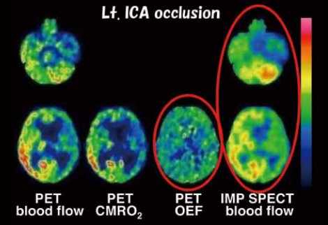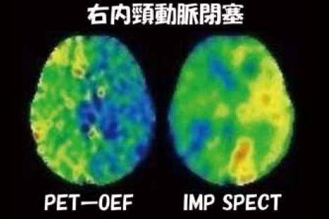 図6 左内頸動脈閉塞症例におけるPETおよびIMP-SPECT画像