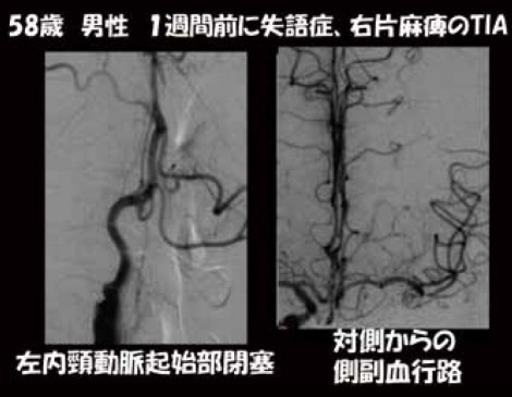 58歳男性の症例。1週間前に失語症と右片麻痺のTIAを発症。脳血管撮影を施行すると、左内頸動脈起始部の閉塞が確認された(図2)。このような場合、PETを撮像すると図3のような画像が得られ、将来的に脳梗塞の再発が予想される。