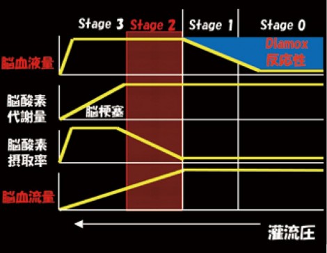 OEFの上昇は脳梗塞再発のハイリスクであることが多くの研究で示されているが、日常的にPET検査が実施できる施設は限られる。そこで、一般的に普及しているSPECTとDiamox負荷を用いることで、CBFとDiamox反応性(CVR)の関係性からStage分類を行っている。