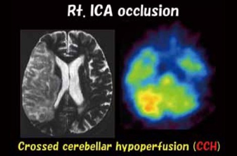 次に、この精度を向上させる方法について考えてみたい。OEFは需要(CMRO2)に対する供給(CBF)の比である。仮にCMRO2がIMP-SPECTで把握できればOEFも算出することができる。例えば右内頸動脈閉塞症例の1カ月後のSPECTを撮影すると、対側の小脳半球の血流が落ちるcrossed cerebellar hypoperfusion(CCH) という現象が起こる(図5)。これは元々、cross cerebellar diaschisisという概念で、一側大脳半球のアクティビティーあるいは代謝が低下すると、対側の小脳半球のアクティビティーあるいは代謝が下がり血流量も低下するという現象である。つまり、健側の小脳半球の血流を見ることで、患側大脳半球の代謝の低下が類推できるということになる。