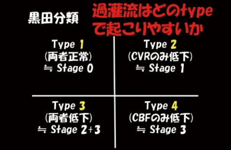 頸動脈内膜剥離術(Carotid endarterectomy:CEA)や頸動脈ステント術(Carotid artery stenting:CAS)後において、過灌流症候群などの重篤有害事象の発生予測にDiamox負荷脳血流SPECTが用いられる。しかしここでも、Diamox使用量は最小限にしなければならない。CEAを実施した患者の術前、術直後、術3日後のIMP-SPECT画像を図7に示す。これが典型的な過灌流である。過灌流が症候化すると最終的に脳内出血が起こり生命の危機に瀕する。内頸動脈が狭窄すると、同側大脳半球の灌流圧が低下し、自動調節能により脳血管が拡張する。この状態が慢性化したところで血行再建されると、同側大脳半球の灌流圧が急激に正常化するが、脳血管は拡張状態のままであるために結果的に血流が増える。これが過灌流の生じるプロセスである。血流は灌流圧と血管の拡張状態で決まるので、術前のDiamox反応性で血管の拡張状態が分かれば過灌流の予測ができる。ただ、過灌流がStage 1で起こるのかStage 2で起こるのかについては実は良く分かっていなかった。黒田分類では、CVRおよびCBFともに正常なものをType 1(≒Stage 0)、CVRのみ低下しているものをType 2(≒Stage 1)、両者ともに低下しているものをType 3( ≒Stage 2+3)、CBFのみ低下しているものをType 4(Stage 3)と定義している(図8)。この定義に基づいて、過灌流はどのタイプに起りやすいかを500例で検討したデータでは、Type 1およびType 4では1例も過灌流が生じておらず、両者が低下しているType 3ではもちろん過灌流を生じた症例が多かったが(46%)、CVRのみ低下しているType 2でも同様の頻度(42%)で過灌流が生じたことが分かった(図9)。このデータから、CVRの低下が過灌流のリスクであることが示唆され、約4割で術後過灌流を起こすと考えられる。