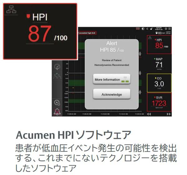 Acumen HPIは1億3千万の心周期のデータから、機械学習を用いて開発した低血圧予測のアルゴリズムである。この予測アルゴリズムを用い、患者の身体的特性と末梢動脈圧波形情報から、低血圧が発生する可能性を指数としてモニタに表示する。また、患者の循環の状態を示す、その他の血行動態情報もリアルタイムでモニタリングしており、関連する血行動態パラメータにより低血圧の原因を示唆する。