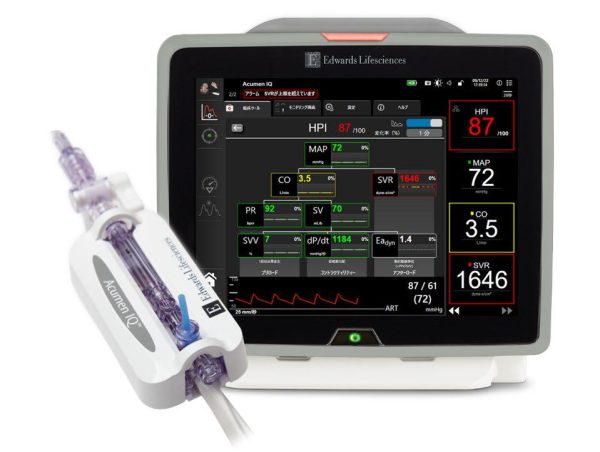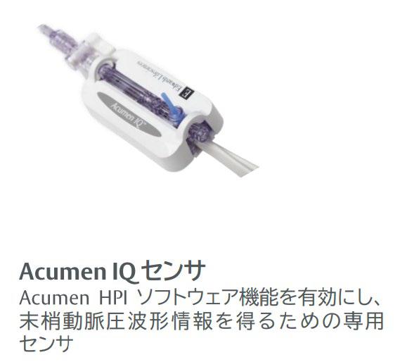 Acumen HPIを利用するには、エドワーズ製モニタと患者の末梢動脈圧波形情報を得るための専用センサである Acumen IQセンサが必要となる。