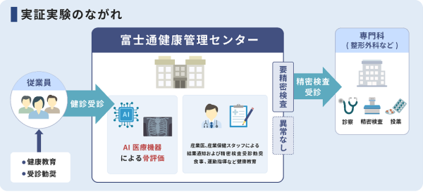 本実証実験では、富士通グループの従業員向け健康診断の受診者の胸部X線写真をAI医療機器で分析し、骨評価を行う。富士通の産業医、産業保健スタッフは従業員に骨の状態の説明や健康指導、教育、健康指導をし、健康行動に移すことを促す。骨の状態によっては、受診・精密検査を勧奨する。これらを受けた従業員の健康意識・健康行動の変化をアンケートなどにより測定し、企業が従業員向けに行う骨の健康増進施策の有用性を検証する。また、本プロジェクトで得られたデータを骨粗しょう症の有病率、骨粗しょう症検査の要精密検査率などの国内外の疫学データと比較して医学的な妥当性を検証し、胸部X線写真の活用による骨評価の有効性を学術的にまとめる。