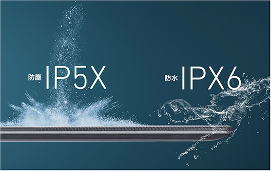 防塵・防水の保護規格(IP56)に準拠。IP5X:防塵5級、IPX6:防水6級